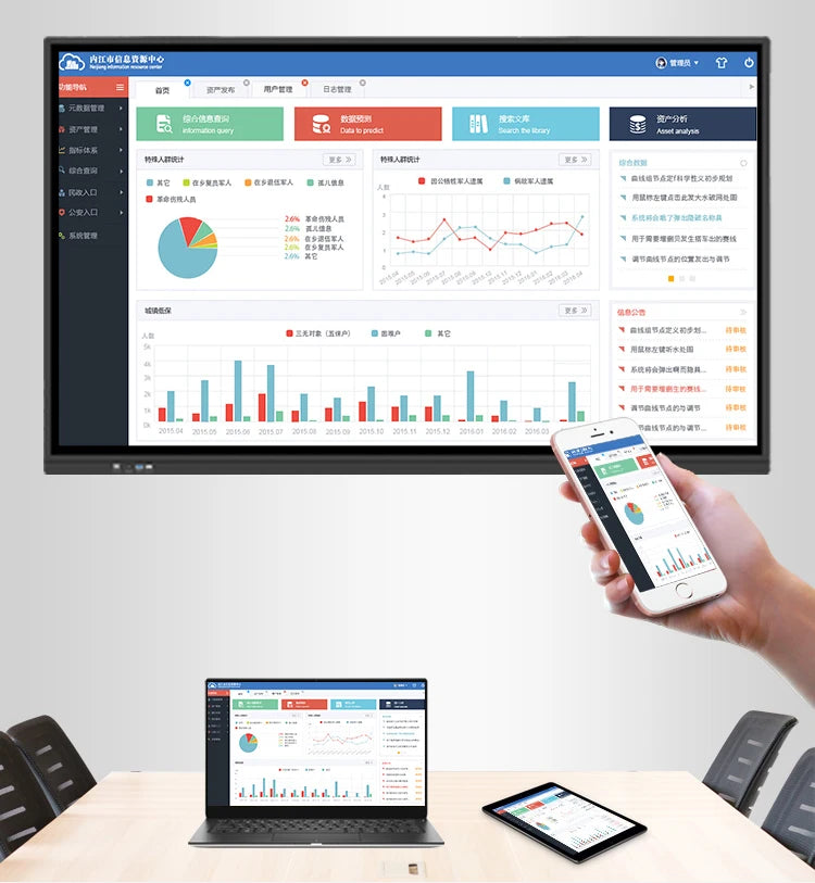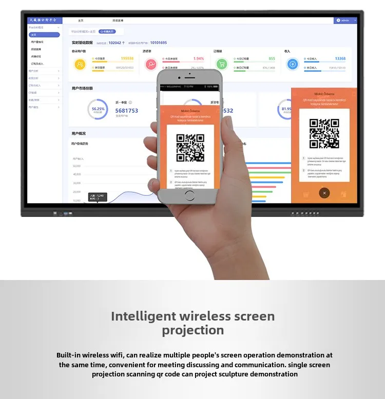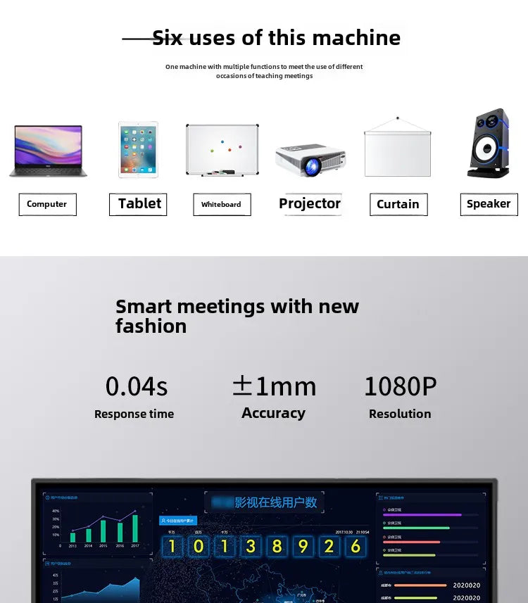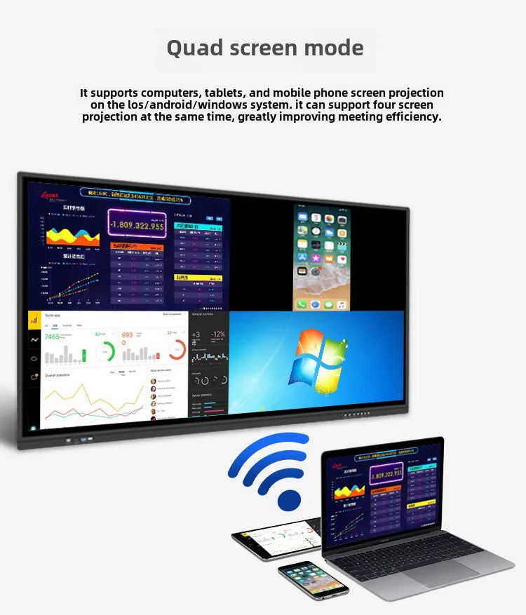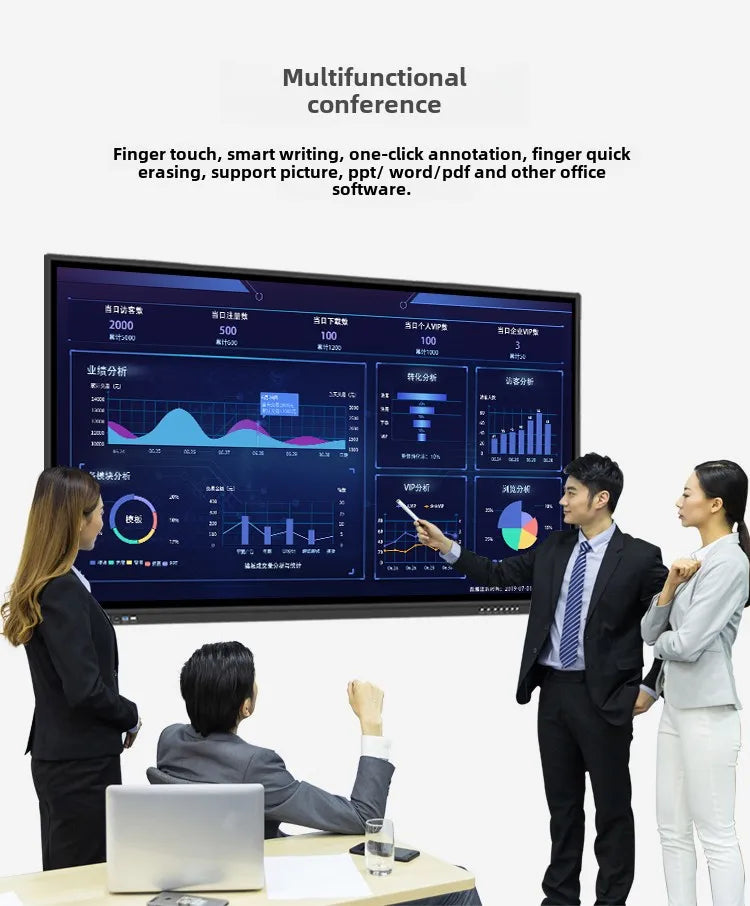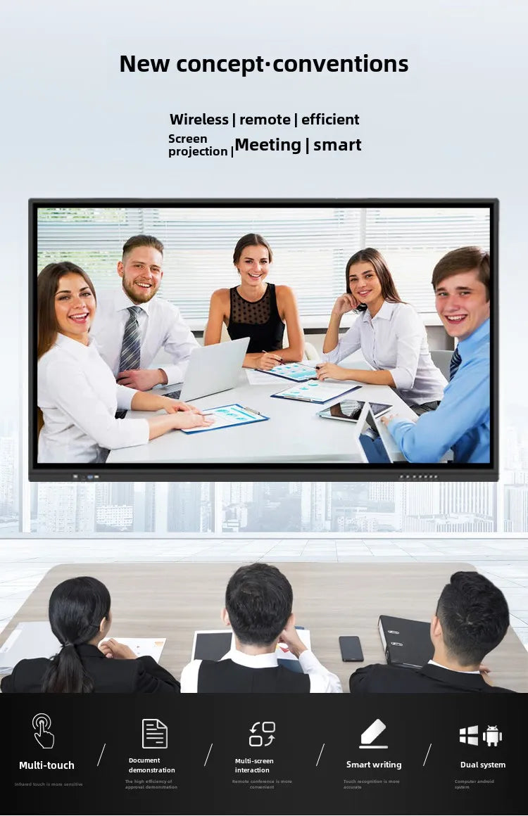Equipped with infrared and capacitive touch technology, users can interact using pen or finger for seamless note-taking and presentations. The device supports Windows 10 and Android systems, providing flexibility across software platforms. Connectivity options include VGA, HDMI, LAN, and USB interfaces alongside built-in Wi-Fi for wireless screen transmission. Multiple hardware configurations are available, featuring Intel processors from i3 to i7, SSD storage up to 120GB, and up to 8GB memory, ensuring powerful performance tailored to diverse needs. This smart board enables efficient collaboration, enhances engagement, and streamlines communication in any conference or teaching setting.