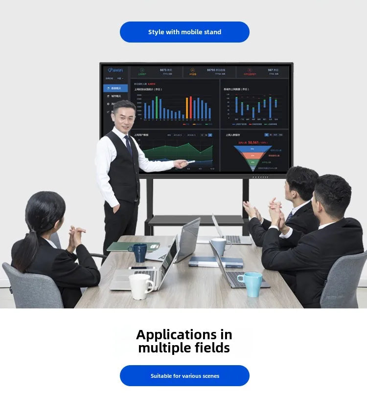 The Interactive Conference Tablet Touch Screen Display offers a versatile solution for modern meeting and educational environments. Crafted from industrial aluminum and cold-rolled steel with a sleek metal baking paint finish, it combines durability with elegance. Available in multiple LED panel sizes from 15 to 110 inches, the display supports Full HD and 4K resolutions with a wide 178° viewing angle and rapid response time under 5ms for smooth, vivid visuals.
