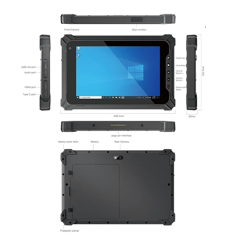 Son écran TFT de 8 pouces offre une résolution de 1280x800 pixels, idéale pour une visualisation nette. Elle intègre des fonctions avancées telles que NFC, un scanner de codes-barres 1D/2D avec une vitesse de 200 scans par seconde, ainsi qu’une connectivité complète (Wi-Fi, Bluetooth, 4G, GPS). Sa batterie longue durée de 10000 mAh garantit une utilisation prolongée sur le terrain, tandis que ses multiples interfaces USB, HDMI, et jack facilitent la connexion d’accessoires et périphériques. Certifiée CE et RoHS, cette tablette robuste est conçue pour un usage industriel intensi
